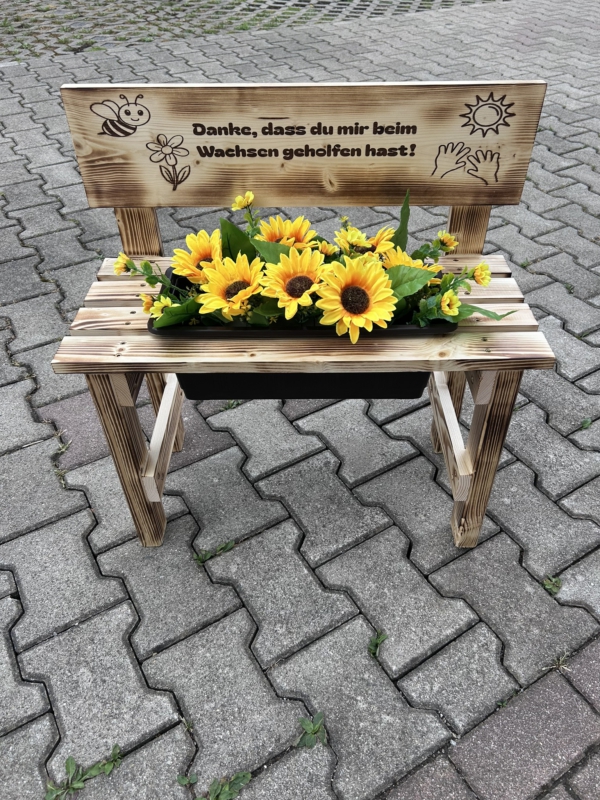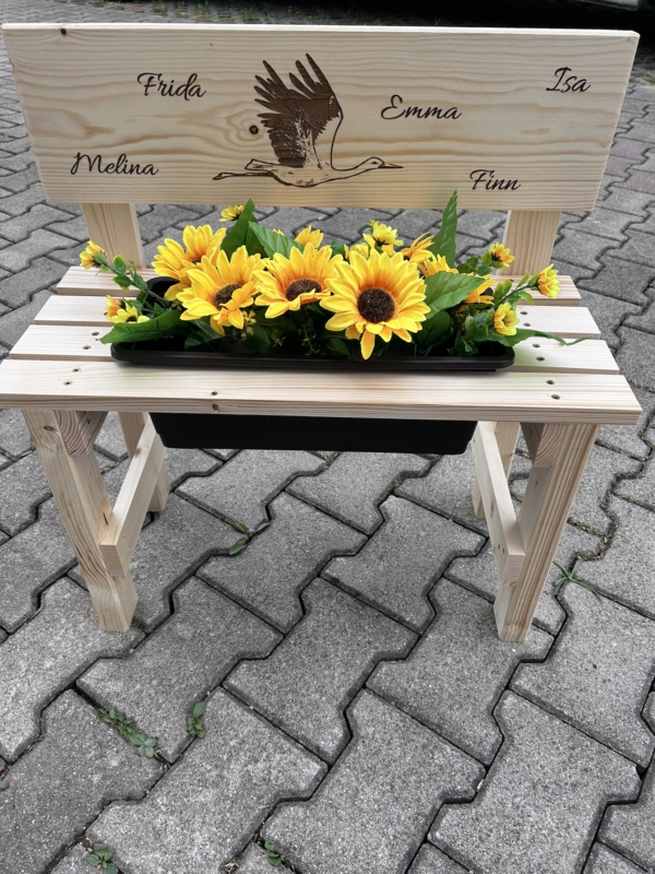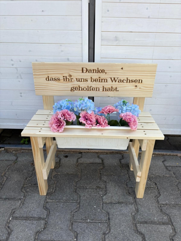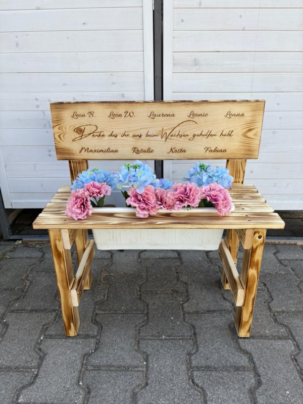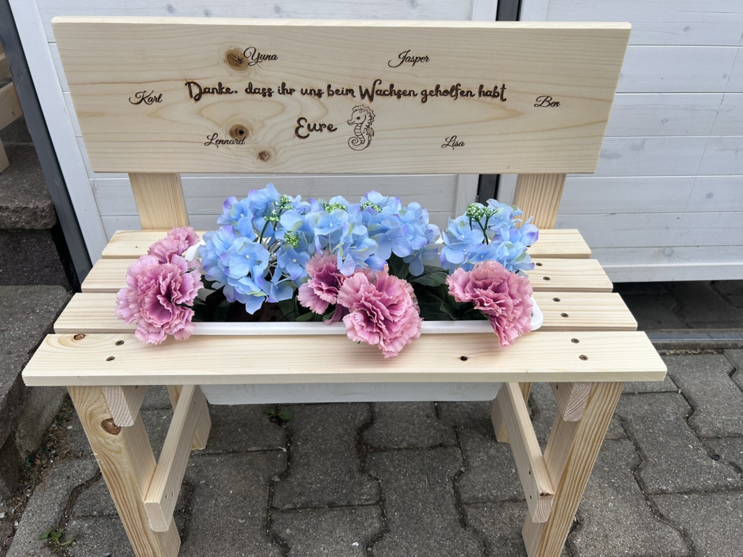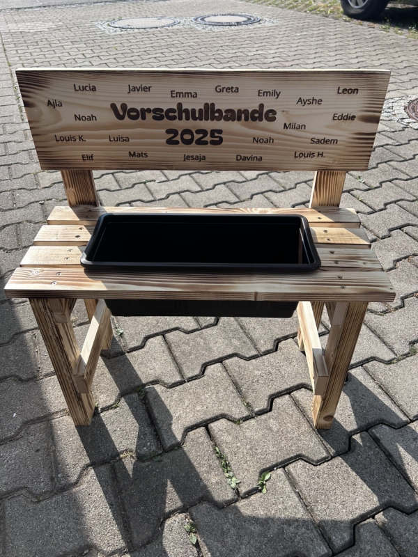 Auf der Lehne können bis zu 30 Kindernamen eingraviert werden – ideal für ganze Gruppen oder Vorschulkinder zum Abschied.