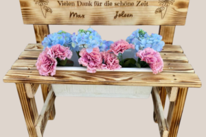 Der gewünschte Name wird dauerhaft ins Holz eingebrannt und macht jede Bank zu einem einzigartigen Einzelstück. Auf Wunsch können zusätzlich Texte oder Motive ergänzt werden – sogar bis zu 30 Namen auf der Lehne sind möglich. So entsteht eine ganz persönliche Erinnerung, die Kinder über viele Jahre begleitet.
