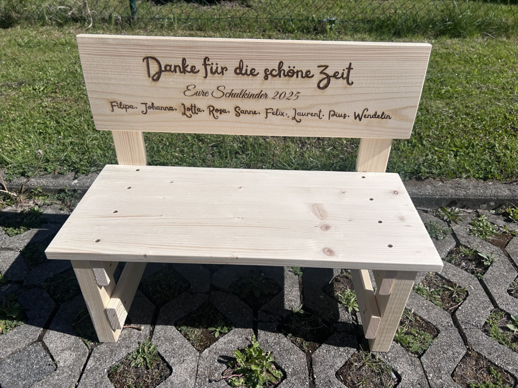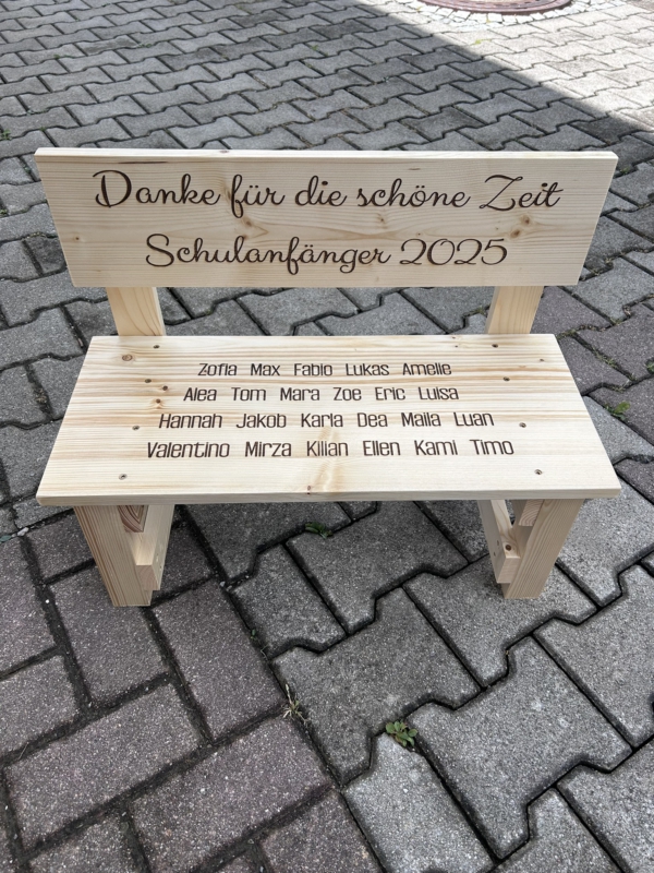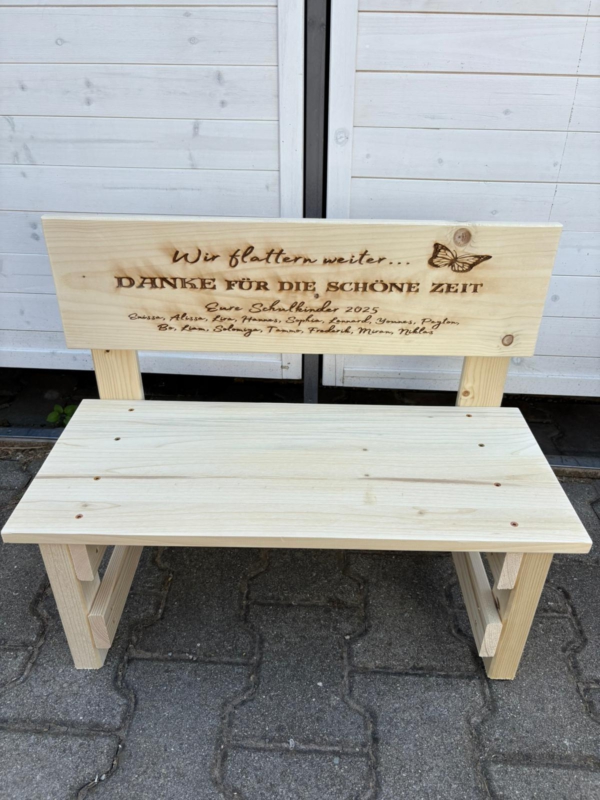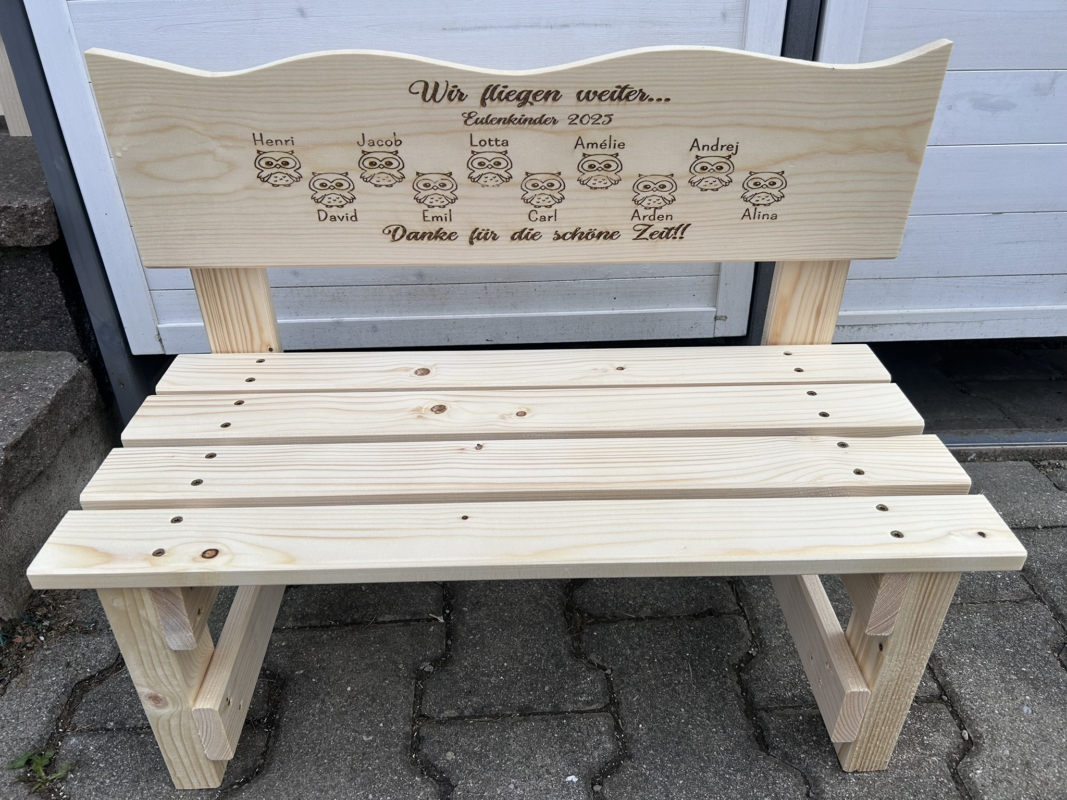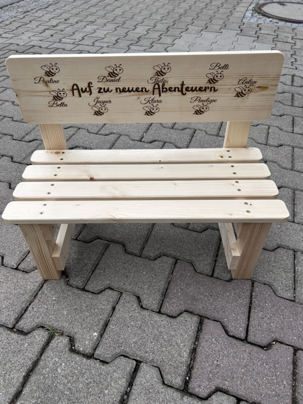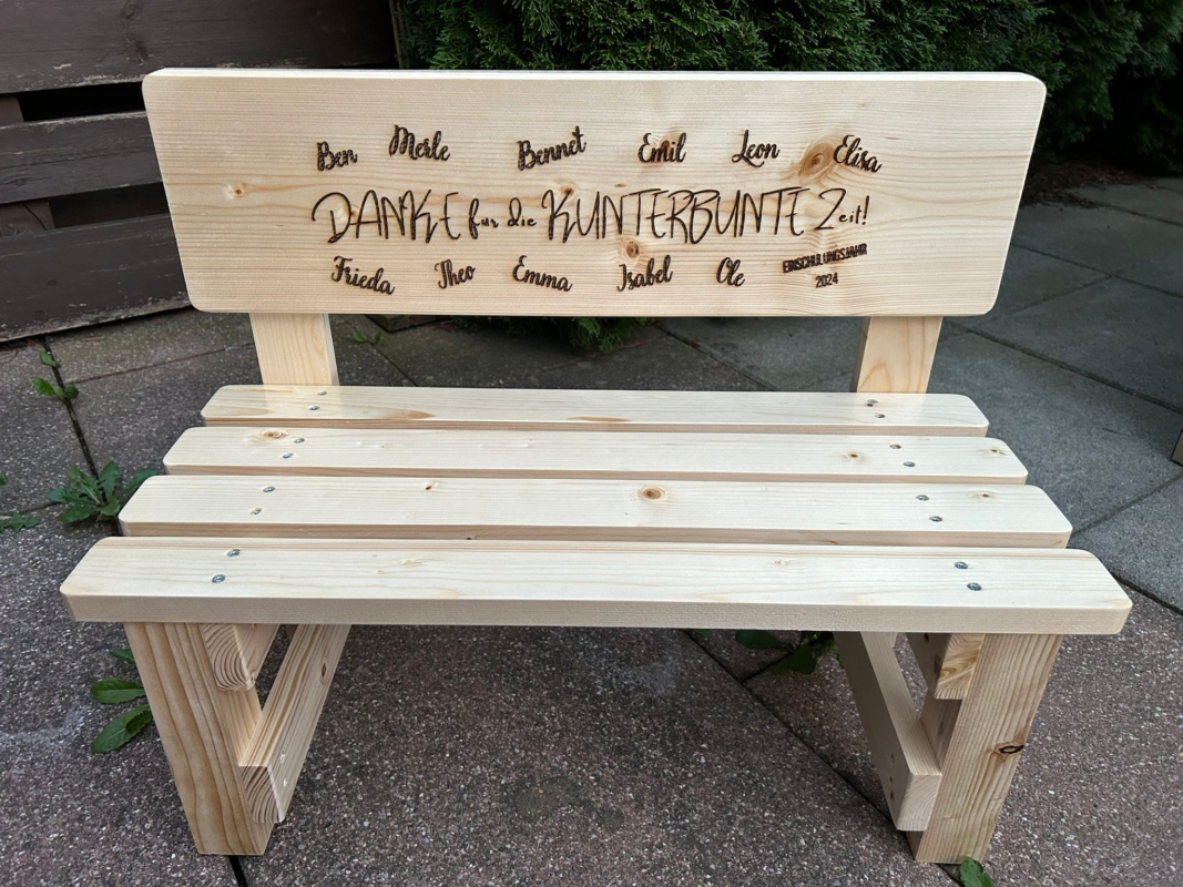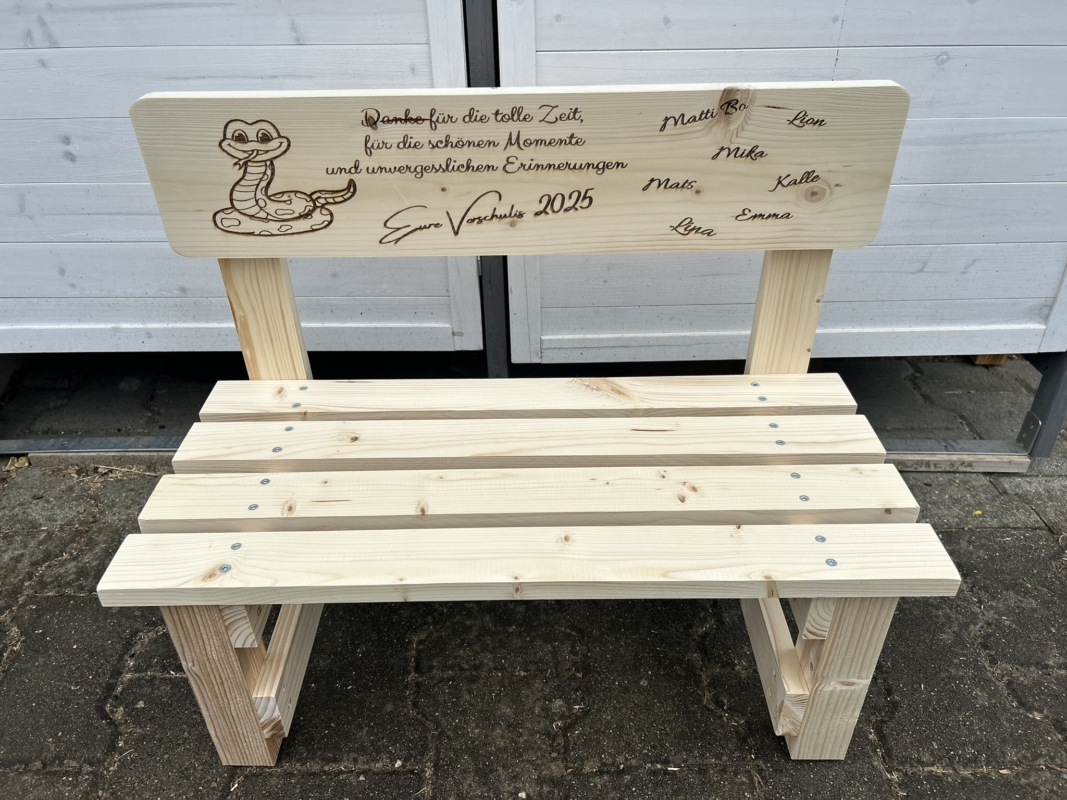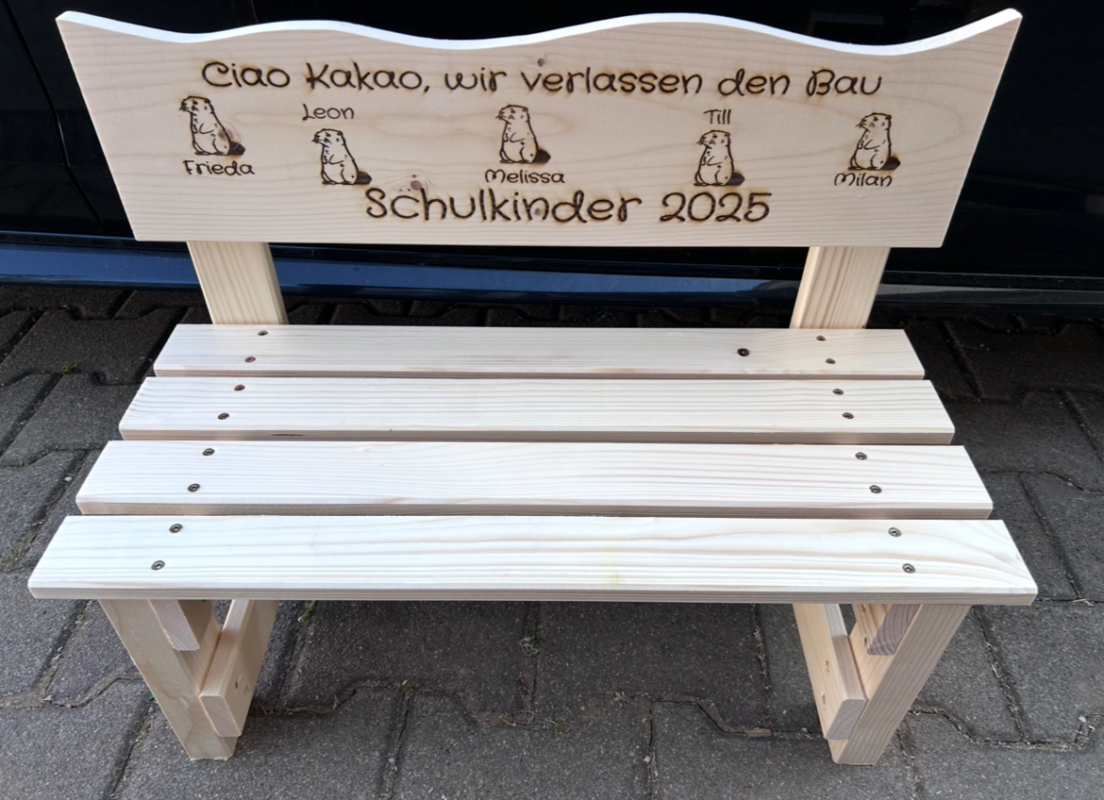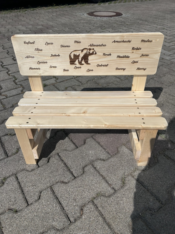 Der gewünschte Name wird dauerhaft ins Holz eingebrannt und macht jede Bank zu einem einzigartigen Einzelstück. Auf Wunsch können zusätzlich Texte oder Motive ergänzt werden – sogar bis zu 30 Namen auf der Lehne sind möglich. So entsteht eine ganz persönliche Erinnerung, die Kinder über viele Jahre begleitet.