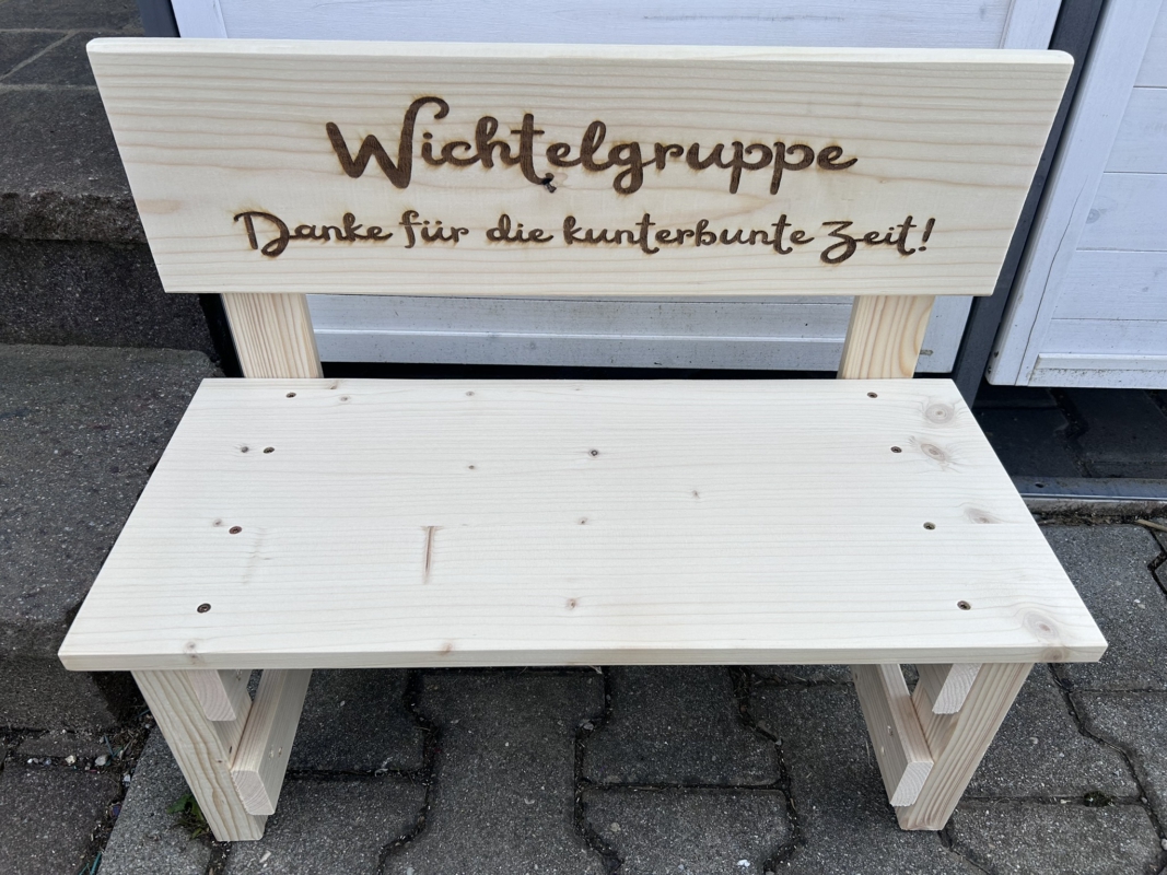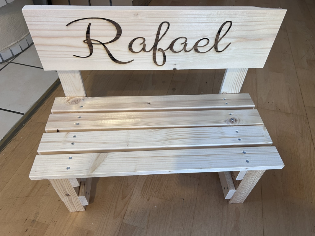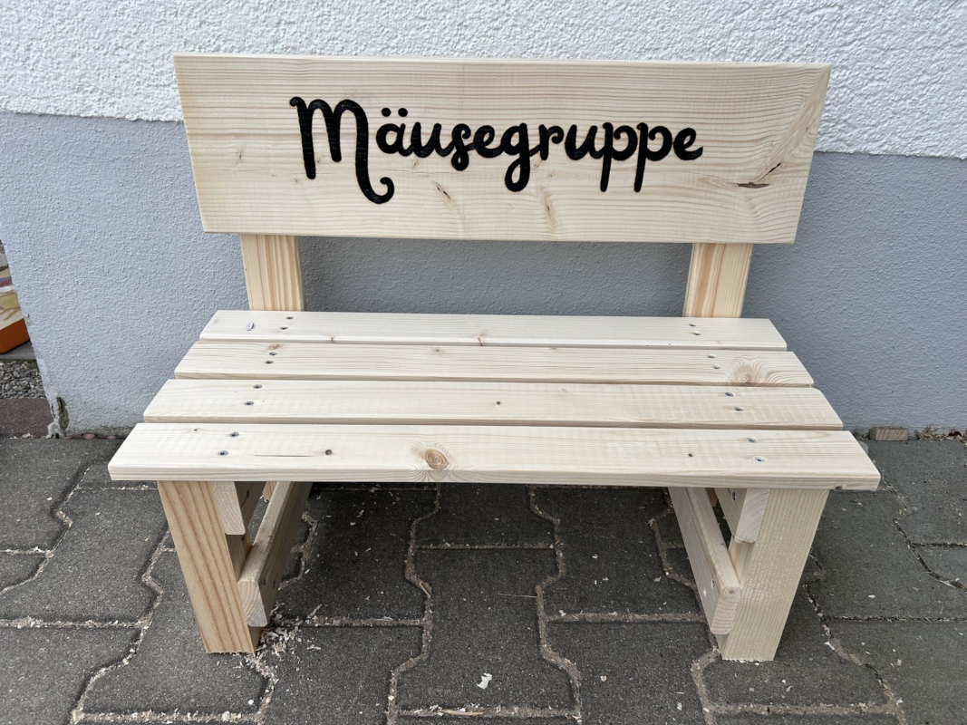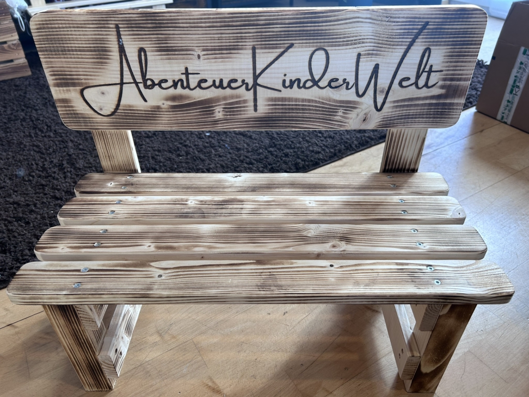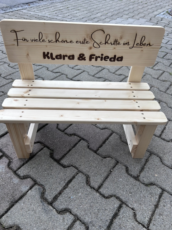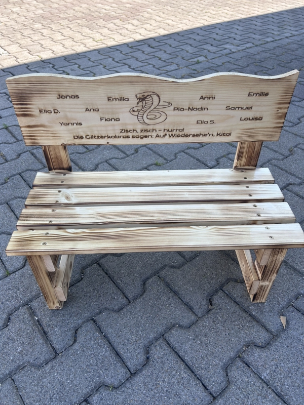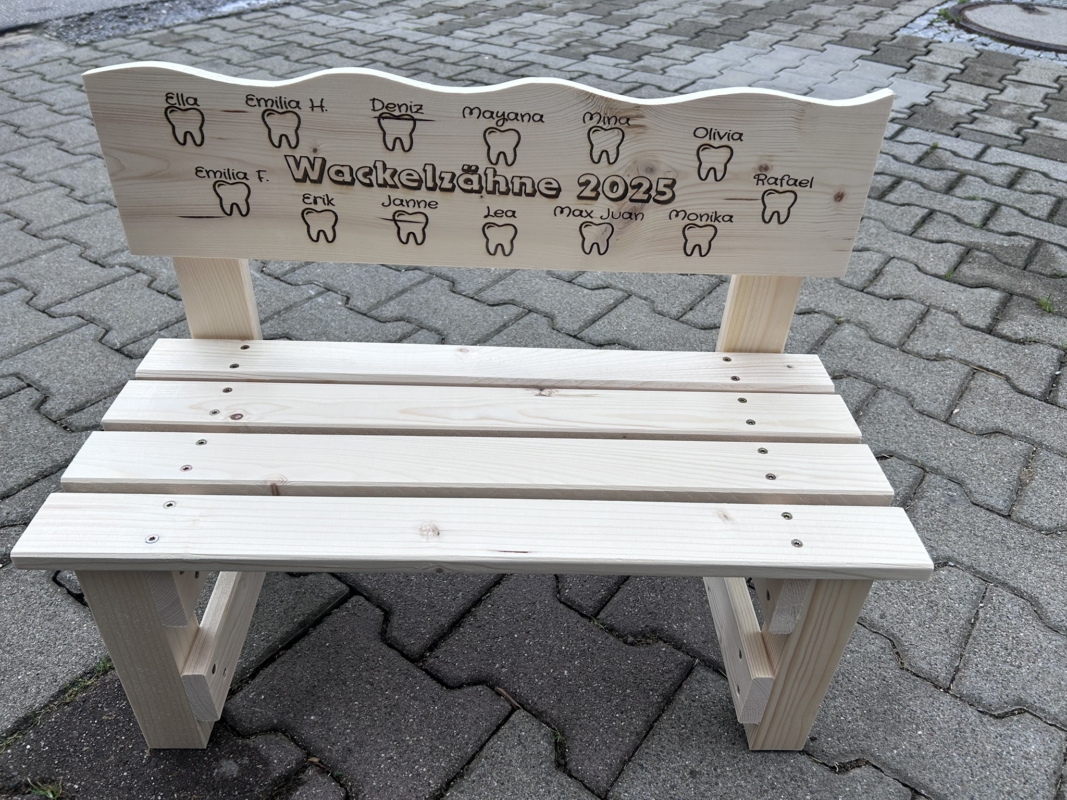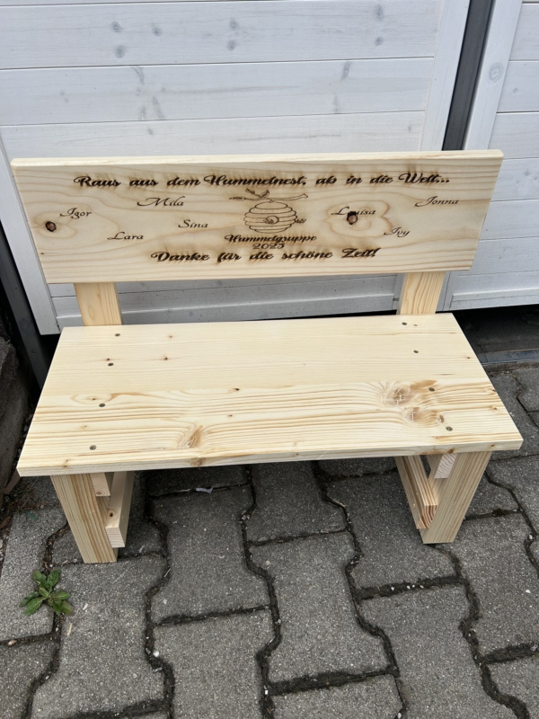 Der gewünschte Name wird dauerhaft ins Holz eingebrannt und macht jede Bank zu einem einzigartigen Einzelstück. Auf Wunsch können zusätzlich Texte oder Motive ergänzt werden – sogar bis zu 30 Namen auf der Lehne sind möglich. So entsteht eine ganz persönliche Erinnerung, die Kinder über viele Jahre begleitet.