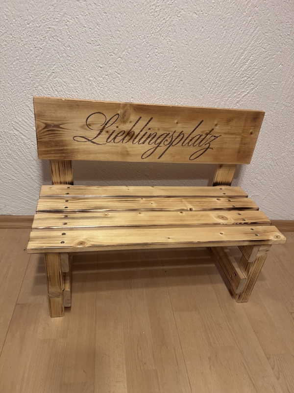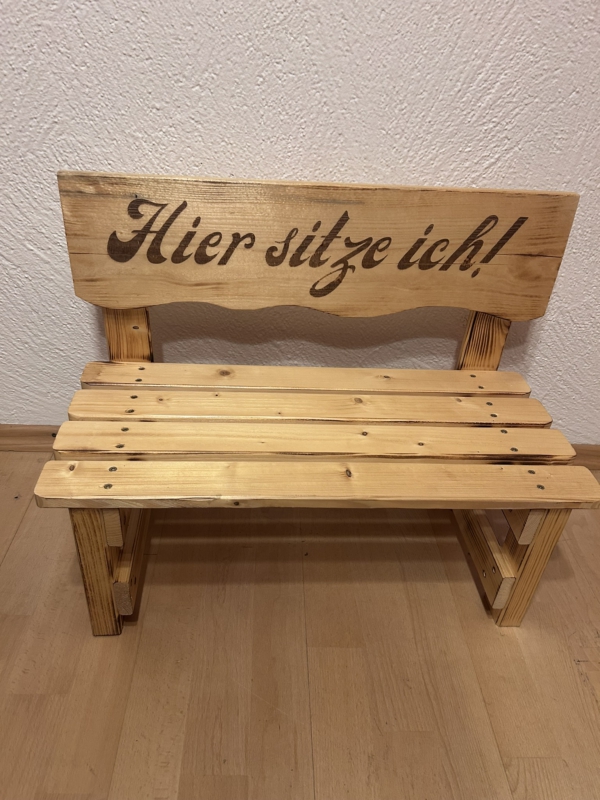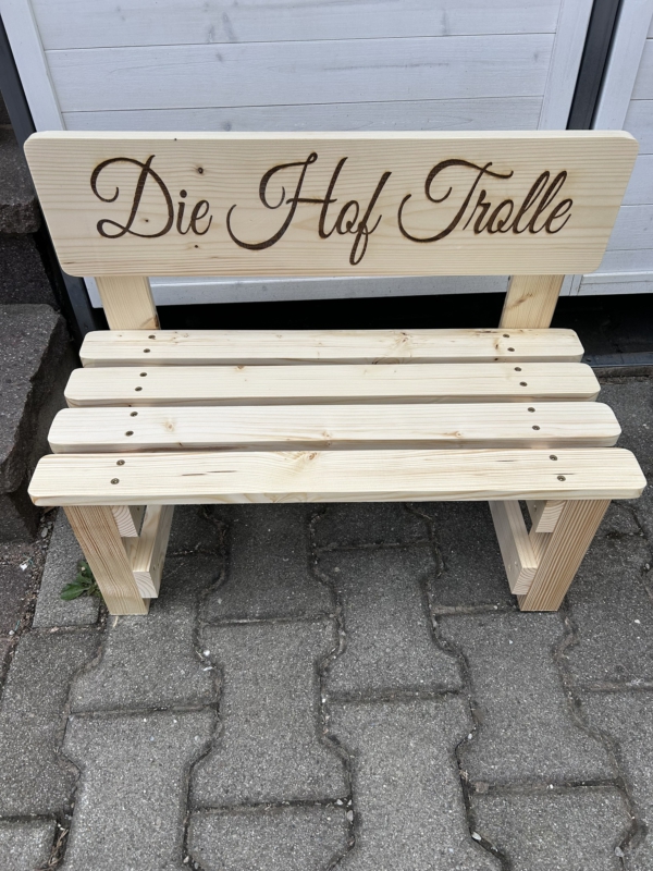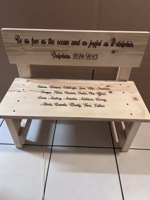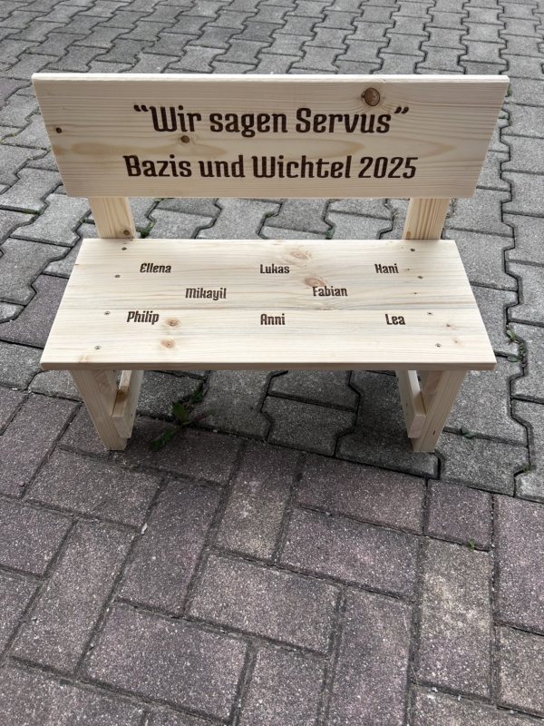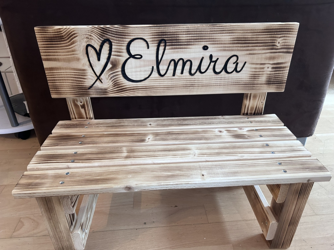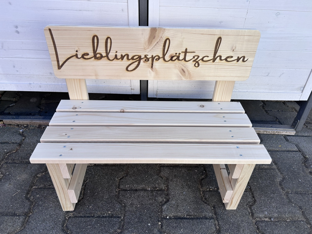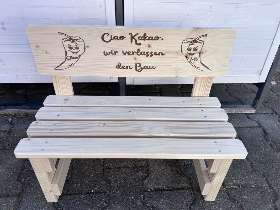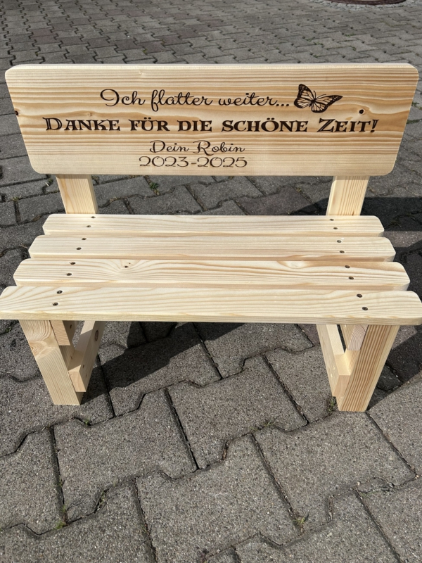 Der gewünschte Name wird dauerhaft ins Holz eingebrannt und macht jede Bank zu einem einzigartigen Einzelstück. Auf Wunsch können zusätzlich Texte oder Motive ergänzt werden – sogar bis zu 30 Namen auf der Lehne sind möglich. So entsteht eine ganz persönliche Erinnerung, die Kinder über viele Jahre begleitet.