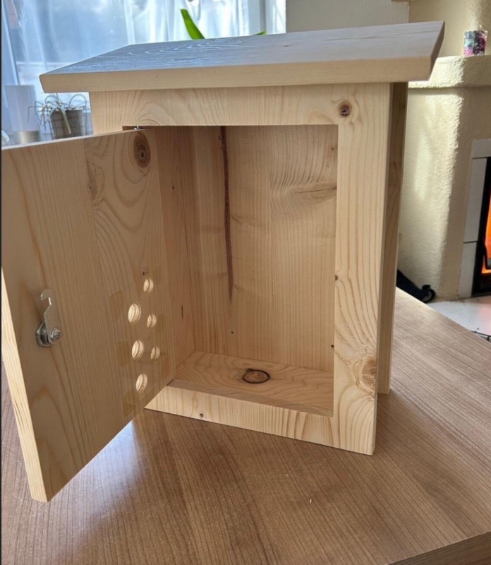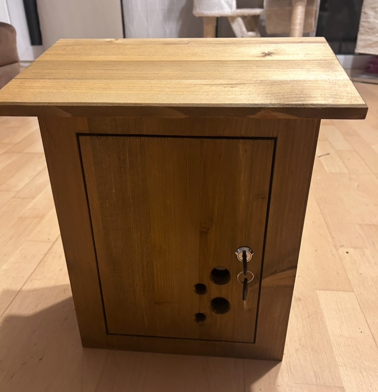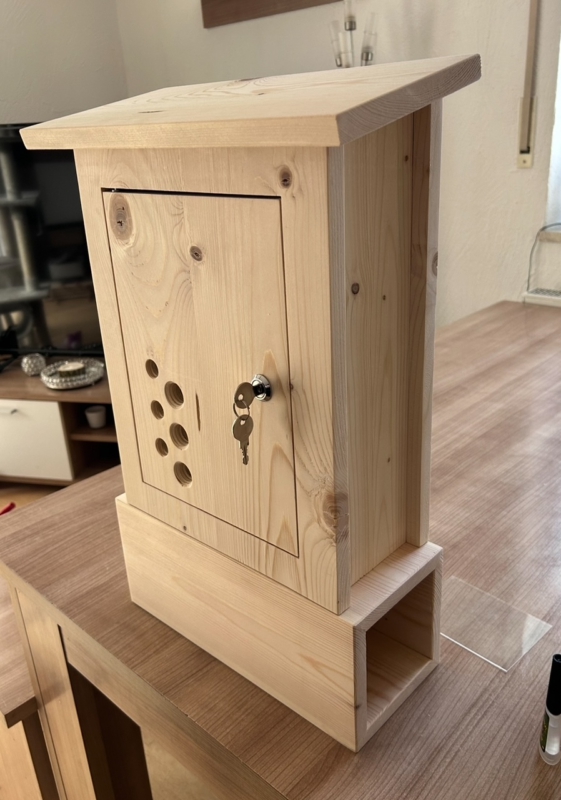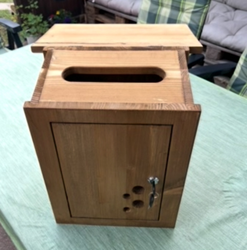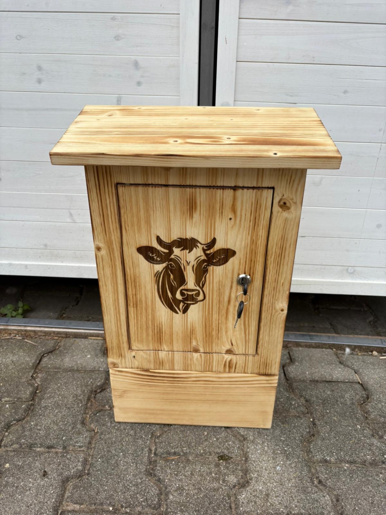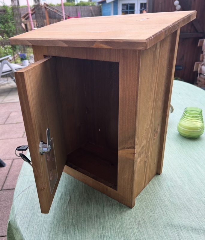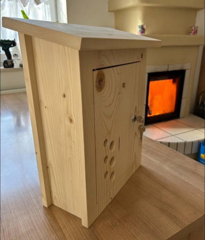 Briefkasten aus Holz mit Schloss und Schlüssel. Optional mit Namensschild (auf dunklem Holz oder in die Tür gebrannt) und Sichtlöcher.