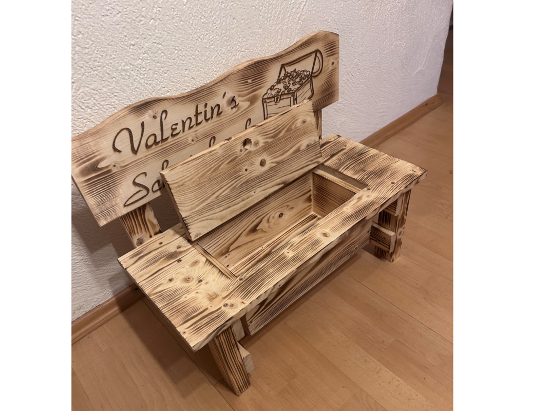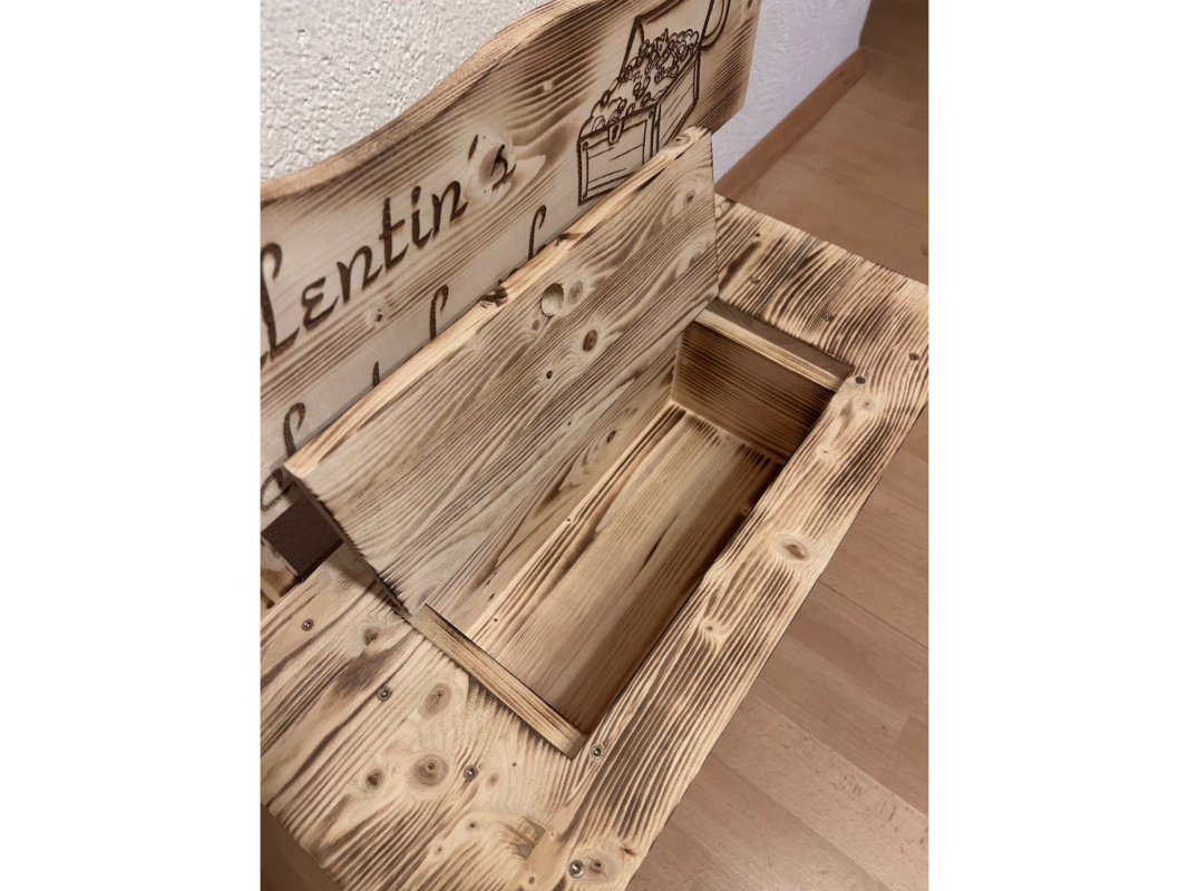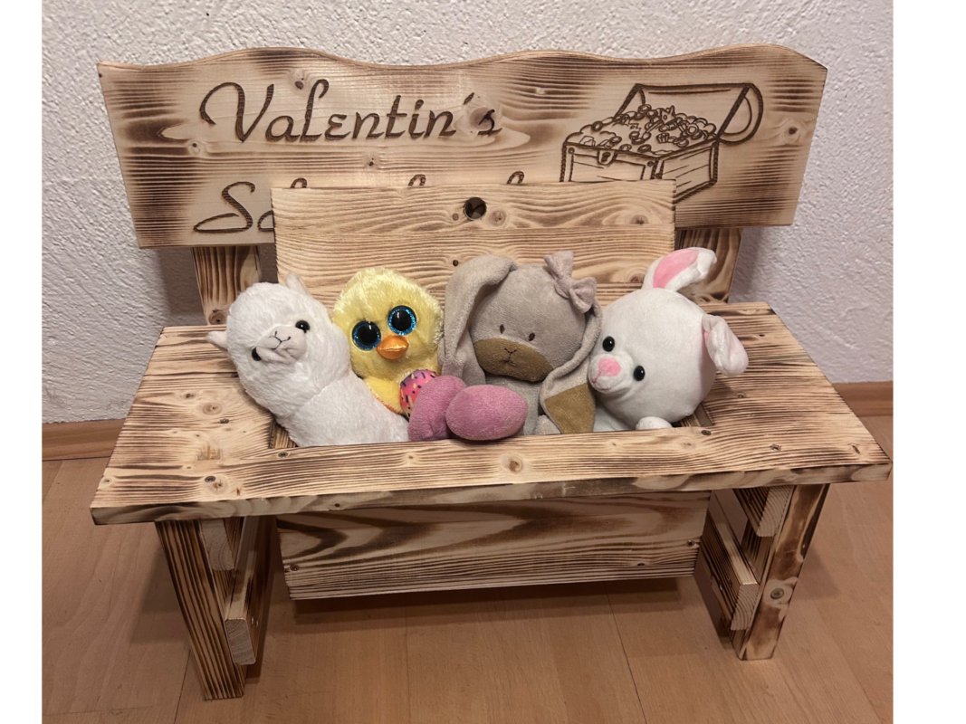 Diese liebevoll gefertigte Kinderbank ist mehr als nur eine Sitzgelegenheit – sie ist eine ganz persönliche Schatztruhe für dein Kind. Unter der Sitzfläche verbirgt sich ein geheimes Fach, in dem Spielzeug, Kuscheltiere oder kleine Geheimnisse sicher aufbewahrt werden können.