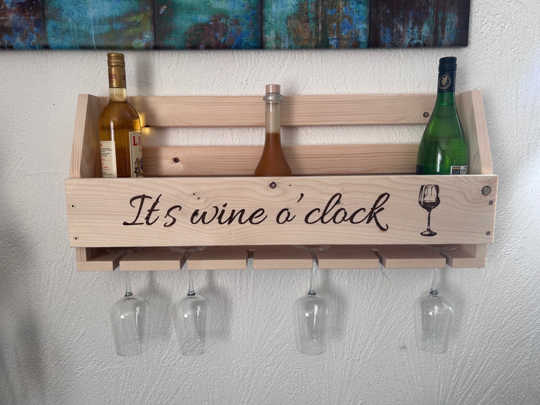 Dieses handgefertigte Weinregal aus massivem Fichtenholz verbindet Funktionalität mit rustikalem Design. Ob in der Küche, im Wohnzimmer, in der Hausbar oder im Essbereich – dein Wein findet hier stilvoll seinen Platz.